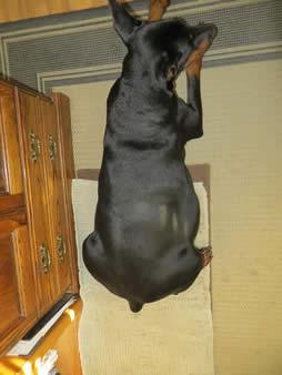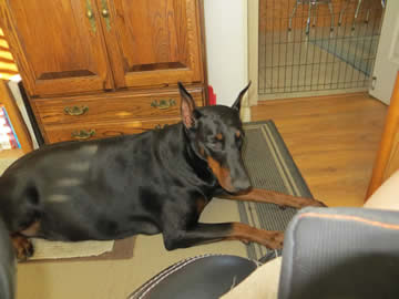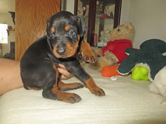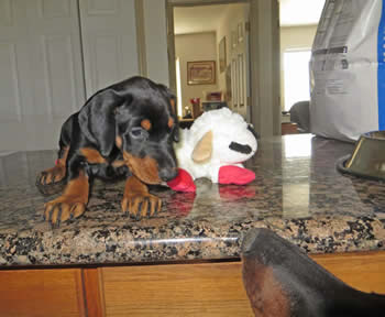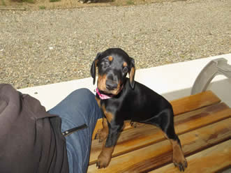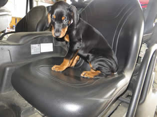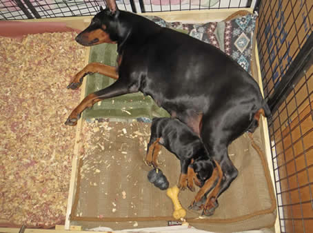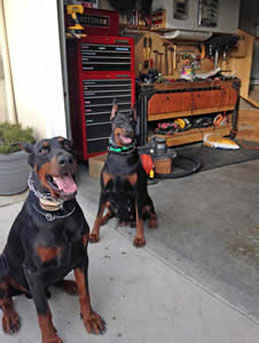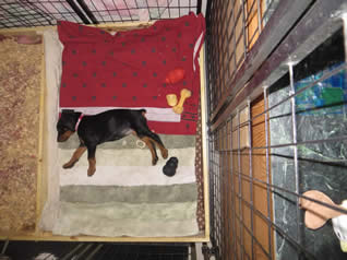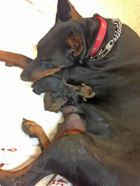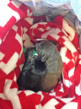 The remaining 2 - red/rust boy,and black/mahogany girl pictured with Coco while at vet for tail and dew claws procedure.
