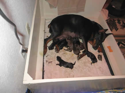 {We are sorry to say as we were expecting this litter to be more than 10 puppies. As it was Coco was having a long delay after the 7th puppy born and she was rushed to urgent care vet hospital to have a C section to save the remaining 3 puppies. So, in all she had 5 boys and 5 girls. As of Tuesday March 29, 2016 something so tragic was occurring to the litter, 24 hours after the c-section. Within 4 hours 7 puppies were lost, and the loss of 2 more. The last puppy (Dakota) as of March 31, 2016 is doing well. We don't know exactly why such a huge loss of this litter but attribute it the C-section surgery of too many drugs used for Coco during and after the surgery for a nursing dam. This has been a very traumatic time for our household.}