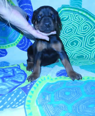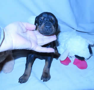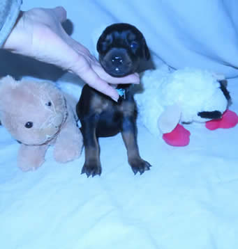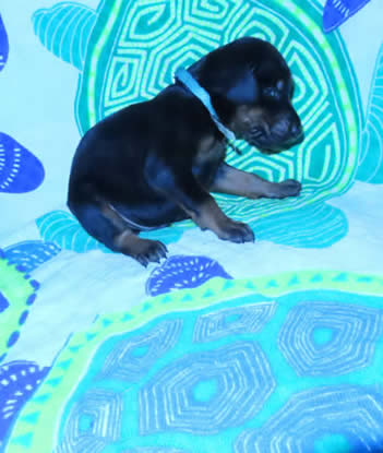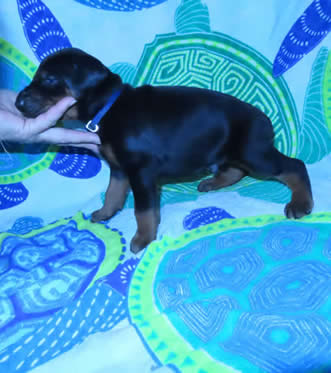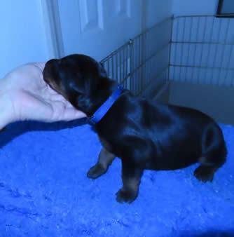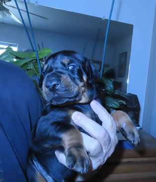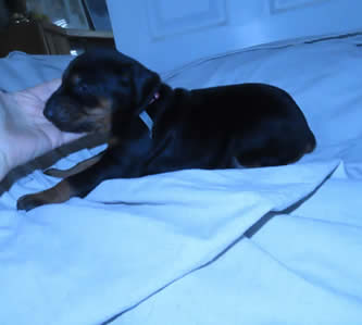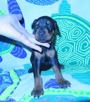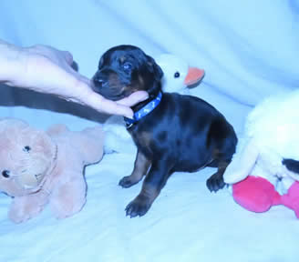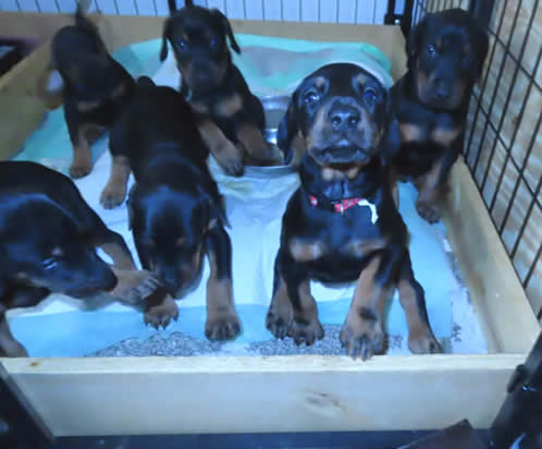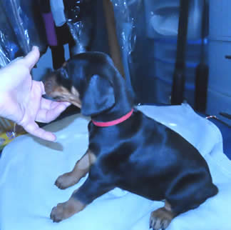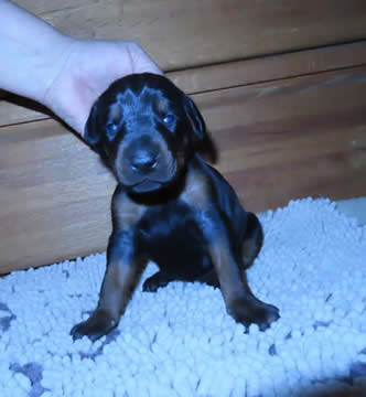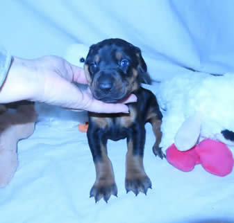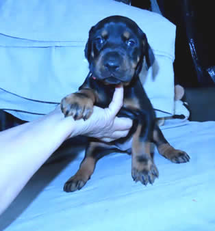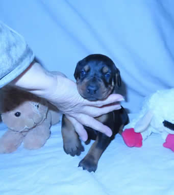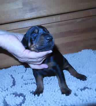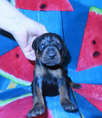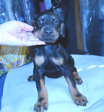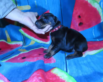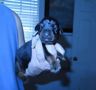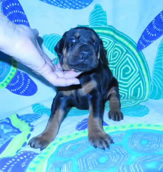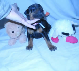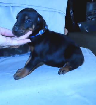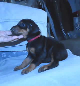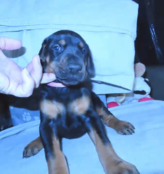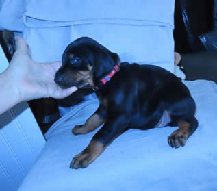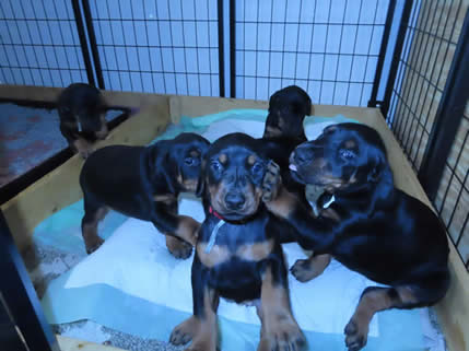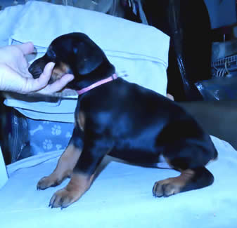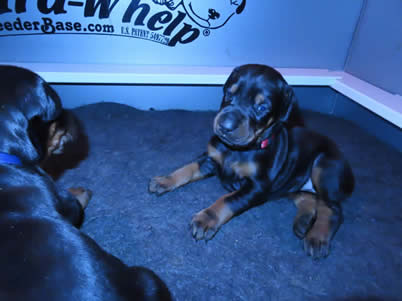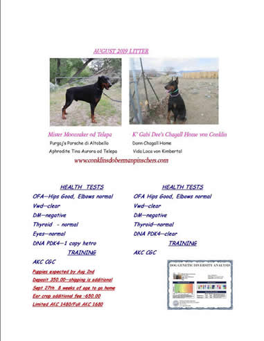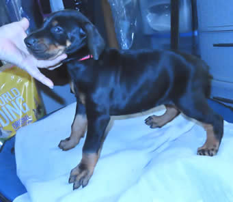 Puppies will come with tail docked. (a fyi - vet does my tail docking, and should they look like eraser head like, it is not the vet's fault. It is momma constantly licking puppies behind cleaning them and stitches can come off from this.) Puppies will be vet checked again at age 6 weeks, and have 1st vaccination shot, worming meds started, and microchipped. At 7 1/2 weeks of age those pups that are having ears cropped will be scheduled at this time. Pup family should provide a picture of crop style preferred. Ears must stay posted until standing. There is no excuse not following instructions or directions from me or my vet with cropped surgery/posting. Once puppies are placed in their new homes, the families should have names for their puppies so I can enter this information with AKC to register all the puppies - no exceptions. It is a price you pay. You can put this certificate in a safe place knowing you have a purebred Doberman Pinscher pup, and is registered with AKC. All puppies will be 'limited AKC' registration. A limited health contract will be with each pup. My goal is bring healthy puppies to a family to enjoy as long as providing loving, caring environment as each pup grows. Please know the breed, and any inherint health risks this breed like any other breed has.
