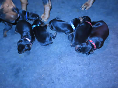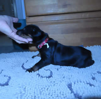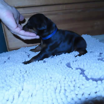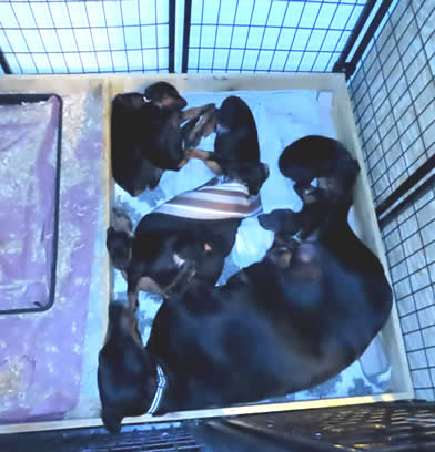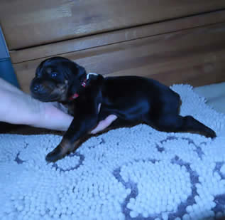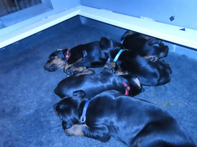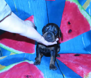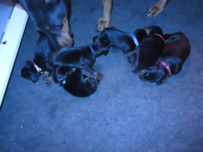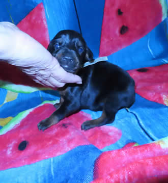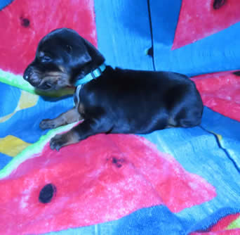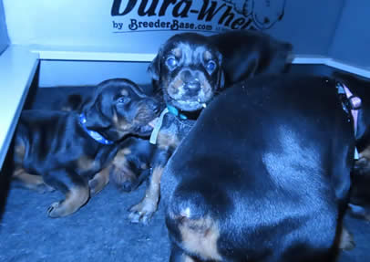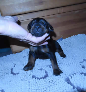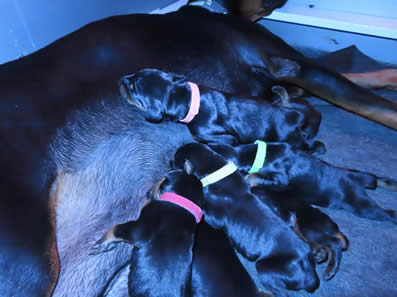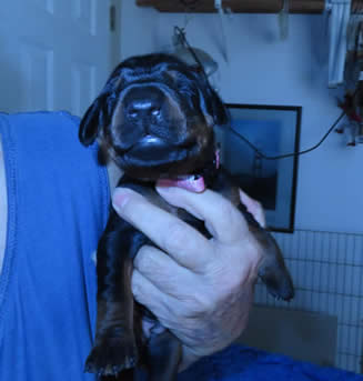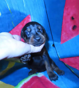 Puppies were born mostly March 26-27th. AKC litter date is March 26, 2022. Gabi was due to have 8 puppies. 1 puppy took over 5 hours to arrive. Oxytocin was approved via my vet for Gabi since labor was delayed several hours. Just before the shot, pup #6 was stillborn. Pup #7 and 8 arrived within minutes after the shot thriving. The surviving 7 pups were doing good even after the first vet appointment for health check, tail dock, and dew claws removed. April 2nd, after several days of supplementing the littlest boy, he went to heaven just before I was taking him to the vet hoping he could live, but he faded out. Neonate is critical stage for Dobermans. It is a very tender time that anything can happen such as fading pup syndrome. I try my best to not have any but it can happen. It hurts to lose a pup. And since, the remaining 6 puppies (3 girls and 3 boys) are continuing to grow each day now. Eyes are opening since the week of April 4th. All puppy information will be on the page until they reach 8 weeks of age and are in their new homes.